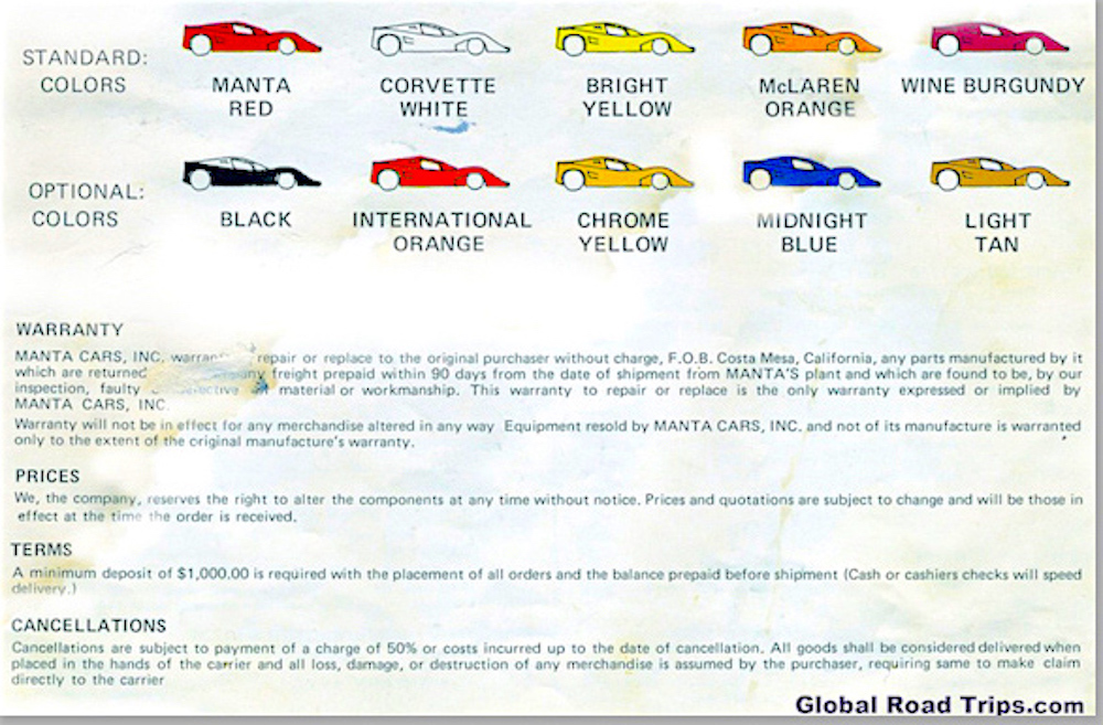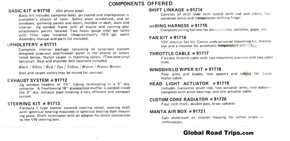 and pics below are from a brochure I saved from the 70's. The Manta was a replica of the Can Am 7 (Canada American Cup) race cars. Can Am rules were, anything and everything goes, including engine size! These cars are also referred to as a Mc Laren, because the Mc Claren race team dominated the sport for years. The Manta repli-car was a natural for the street because of its unique 2 person seating arrangement and will be remembered as one of the finest kit cars ever made. ~ P. Usle |